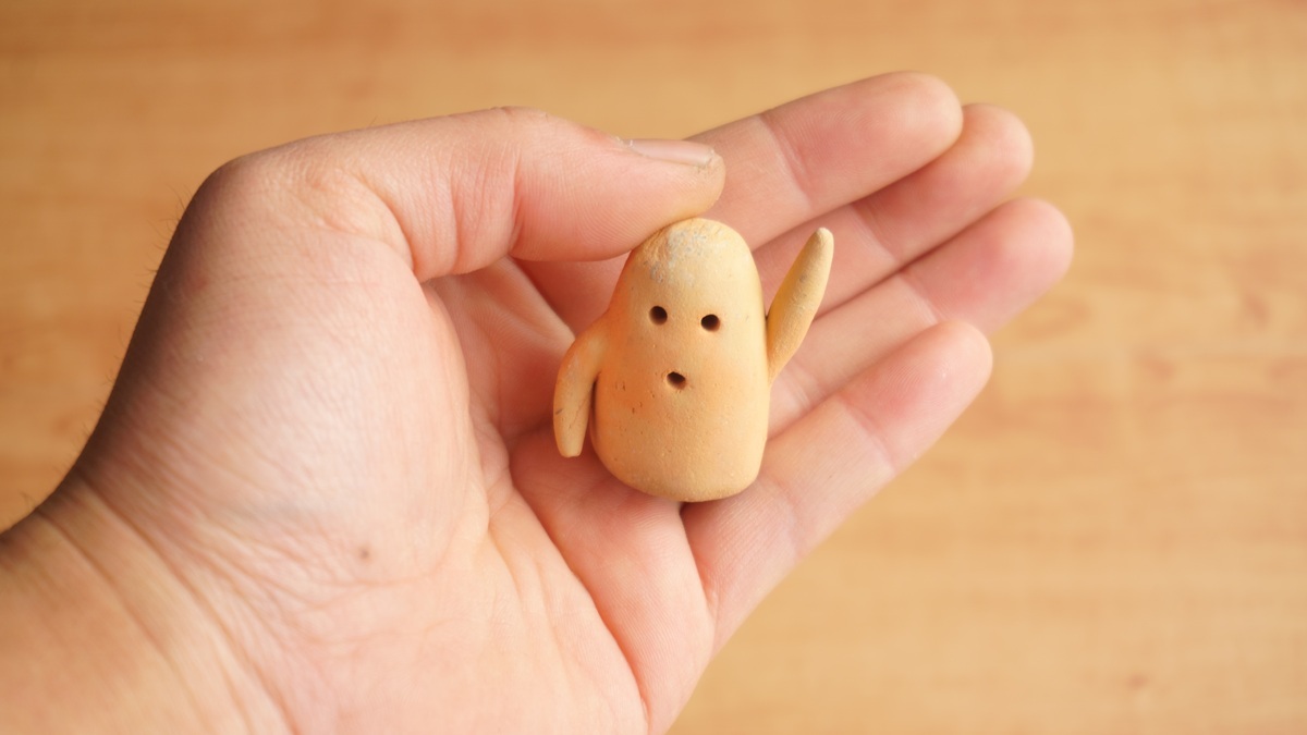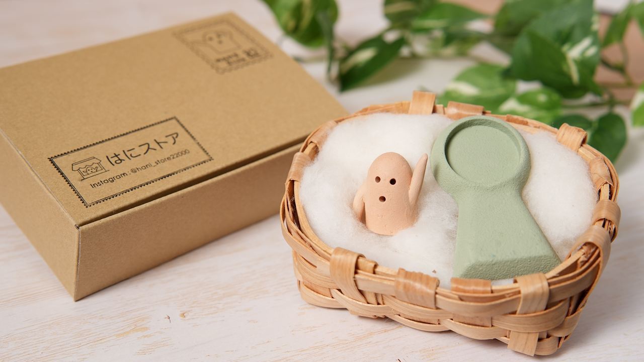 手のひらに収まる小さな埴輪のキャラクター『はにはに』と専用の古墳スタンドのセットになってます。古墳スタンドはお好みのカラーがお選びいただけます。
