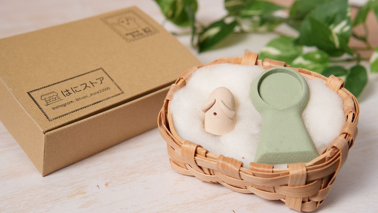 手のひらに収まる小さな埴輪のキャラクター『はにはに』と専用の古墳スタンドのセットになってます。古墳スタンドはお好みのカラーがお選びいただけます。