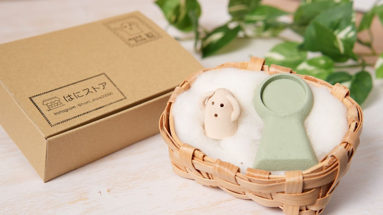 手のひらに収まる小さな埴輪のキャラクター『はにはに』と専用の古墳スタンドのセットになってます。古墳スタンドはお好みのカラーがお選びいただけます。
