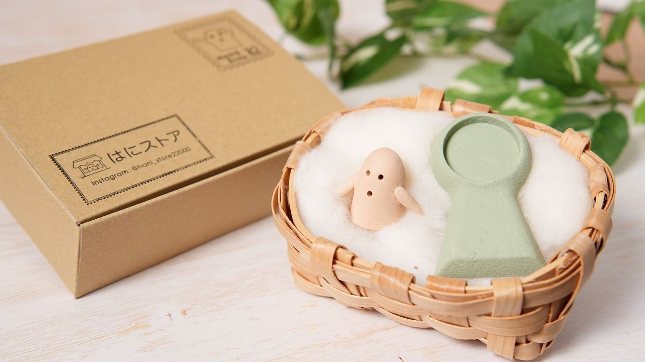 手のひらに収まる小さな埴輪のキャラクター『はにはに』と専用の古墳スタンドのセットになってます。古墳スタンドはお好みのカラーがお選びいただけます。